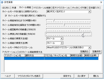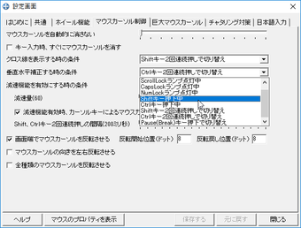 例えば、マウスカーソルの動きを垂直/平行に制限したり、デスクトップ画面の右端、下端にカーソルを移動した際マウスカーソルの向きを反転させたり、あるいは、マウスホイールのないマウスを利用七得る際、マウスの移動でウィンドウをスクロールさせえる機能。マウスカーソルを巨大化させたり、カーソルの画像を任意の画像に差し替えられたりする機能など、豊富な設定オプションがあるので、好みに合わせて自由にカスタマイズ可能だ。